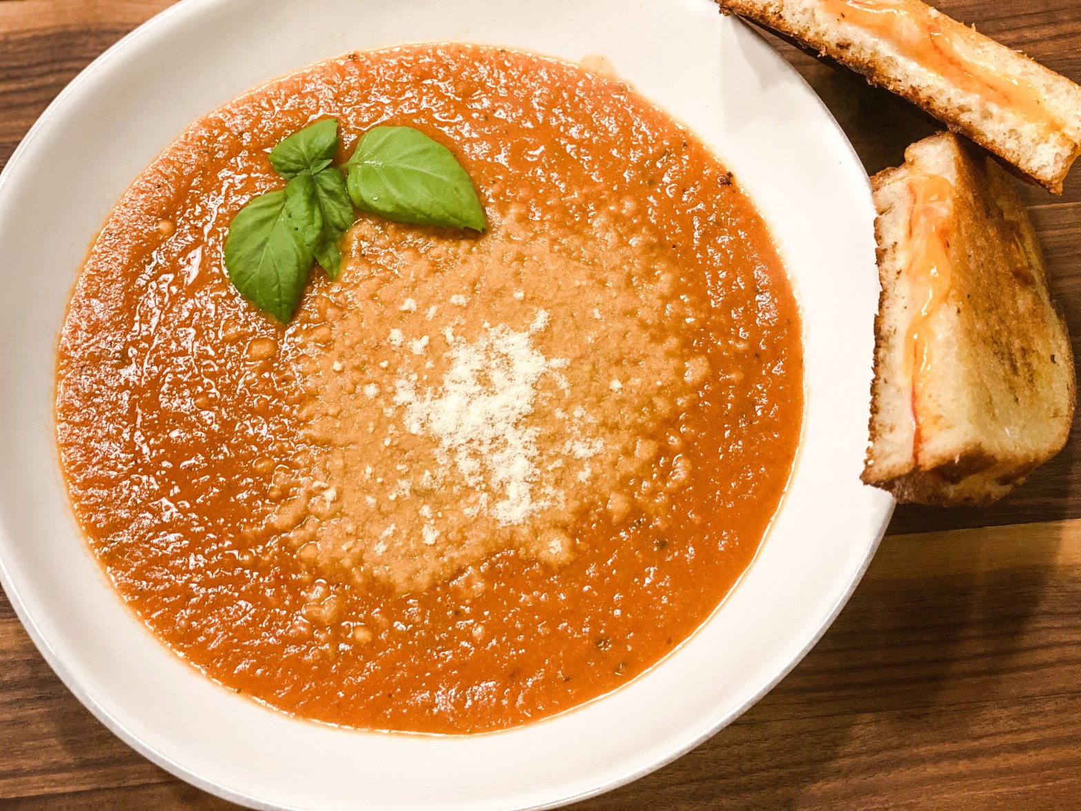 7. Pour soup into bowls and garnish with fresh basil and parmesan cheese! Note: I HIGHLY recommend serving this with a grilled cheese – it’s the perfect comfort food combo – and it’s great for soaking up all that yummy soup!